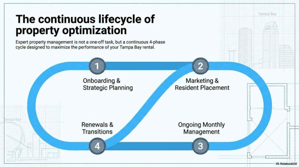 Our expert property management process is divided into four distinct phases designed to maximize the performance of your Tampa Bay rental property: